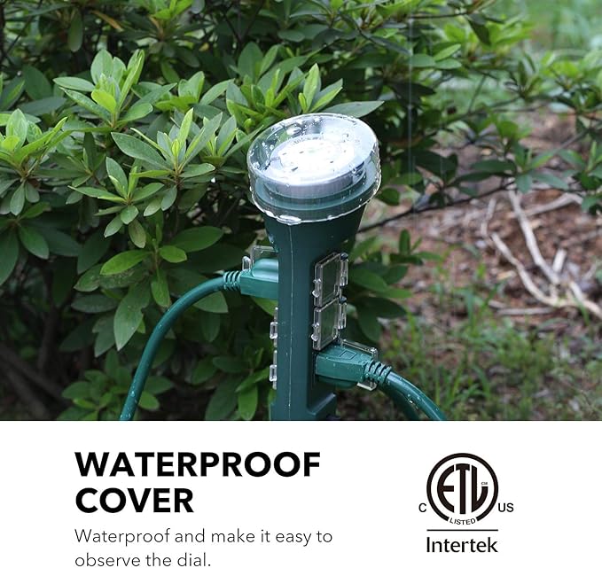 • FOR OUTDOOR USE: Use during rain days. Clear weatherproof cover provides protecting timer from weather conditions. Individual safety covers protect outlets from water, dust and damage. Also comes with a 72 inch green cord that blends in with your garden.