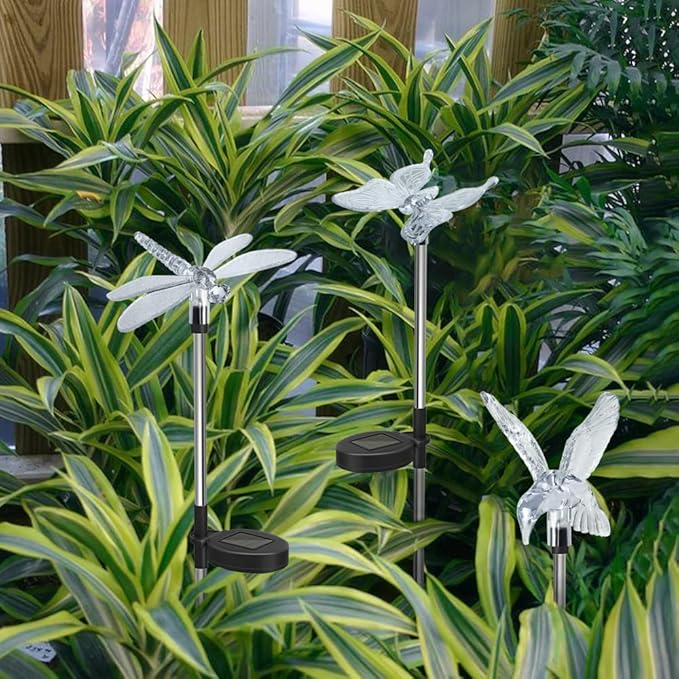 • Solar Insect Lights Outdoor: This garden stake light set includes 2 butterflies, 2 hummingbirds and 2 dragonflies, each light has 1 high brightness light bead and light transmitting crystals that change the color of the lighting at night