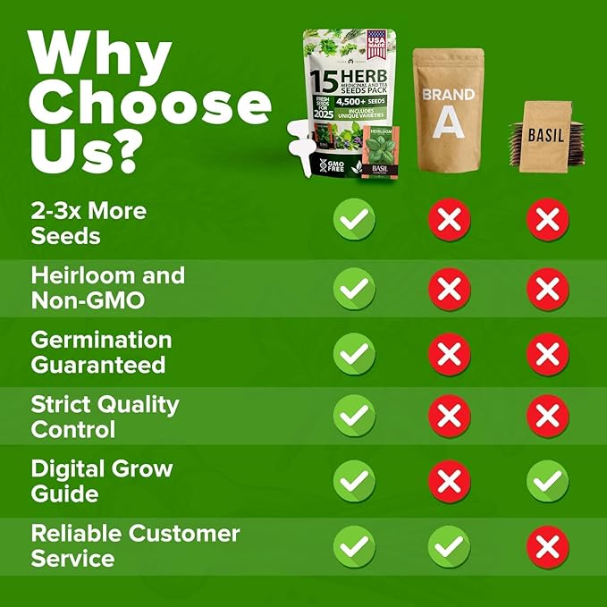 - High-Quality, Non-GMO & Heirloom Herb Seeds: This selection features 4,500+ seeds from 15 heirloom herb varieties that are completely non-GMO.These herb seeds are perfect for those seeking a sustainable, eco-conscious way to grow herbs indoors or in backyard garden beds. With high germination rates, they provide dependable results whether grown hydroponically or in soil. Ideal for those searching for the best herbs to grow indoors or outdoors with long-lasting yields season after season.