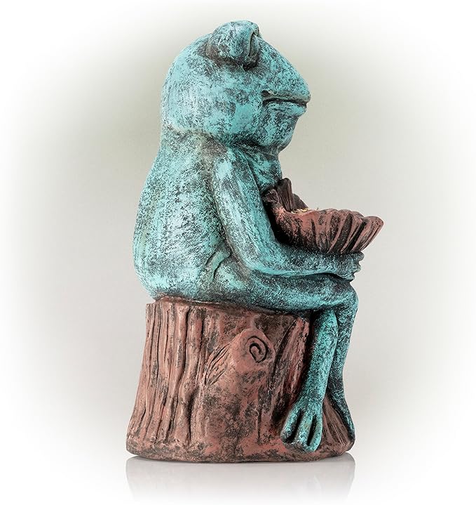 • GARDEN STATUE: Lawn figurine features a happy frog sitting on a tree trunk and holding a flower for a fun addition to your home's outdoor area