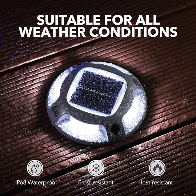 • 【IP68 WATERPROOF SOLAR LED DECK LIGHTS】With an IP68 waterproof design and a tightly sealed battery compartment, these solar driveway reflectors lights can resist any terrible weather, like a rainstorm, or daily heat.