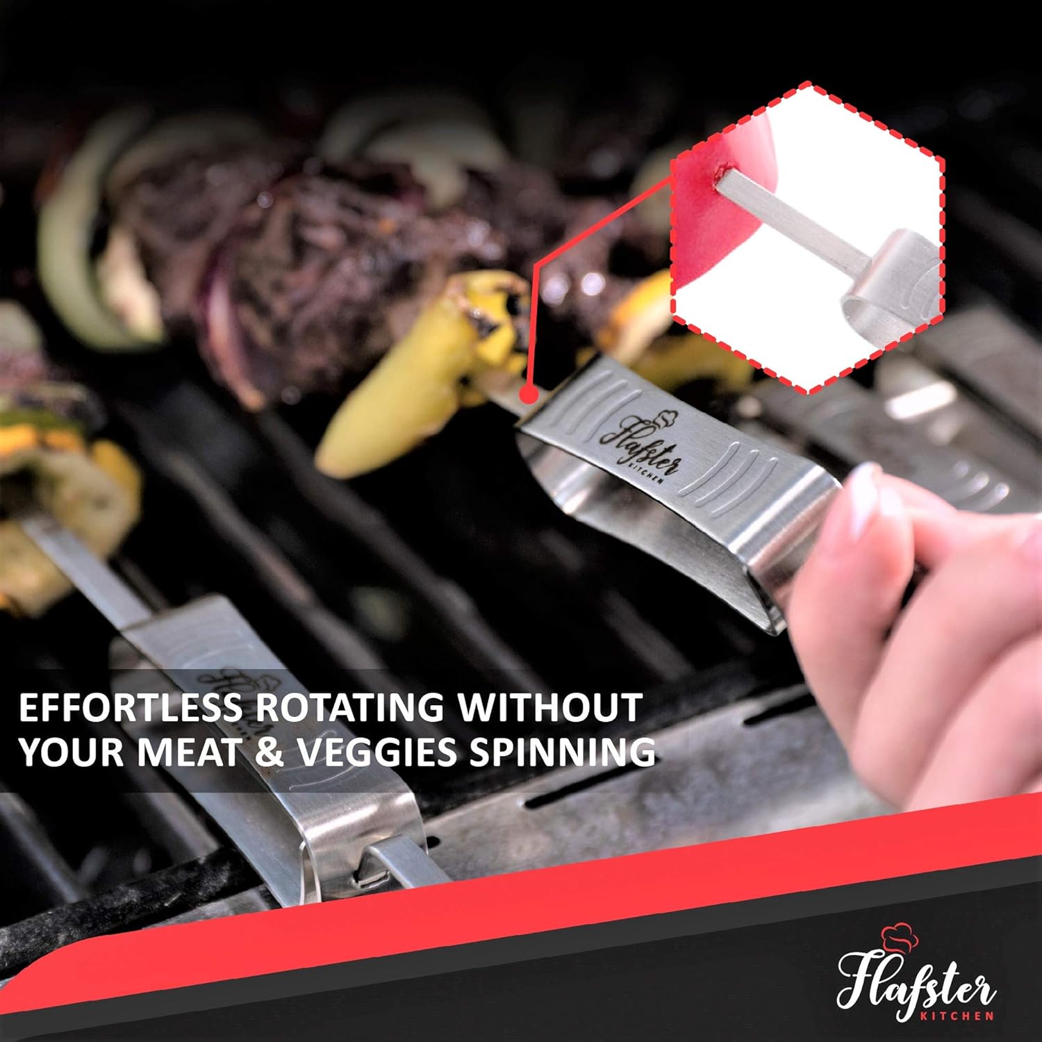 • HIGH QUALITY: Made with high quality stainless steel 304 unlike other skewers made with inferior Stainless Steel 430 that rusts easily; Our food skewers pass in-house quality inspection as well as a third party quality inspection to ensure you get only the best; The sturdy design ensures you will use the barbecue skewers for years to come