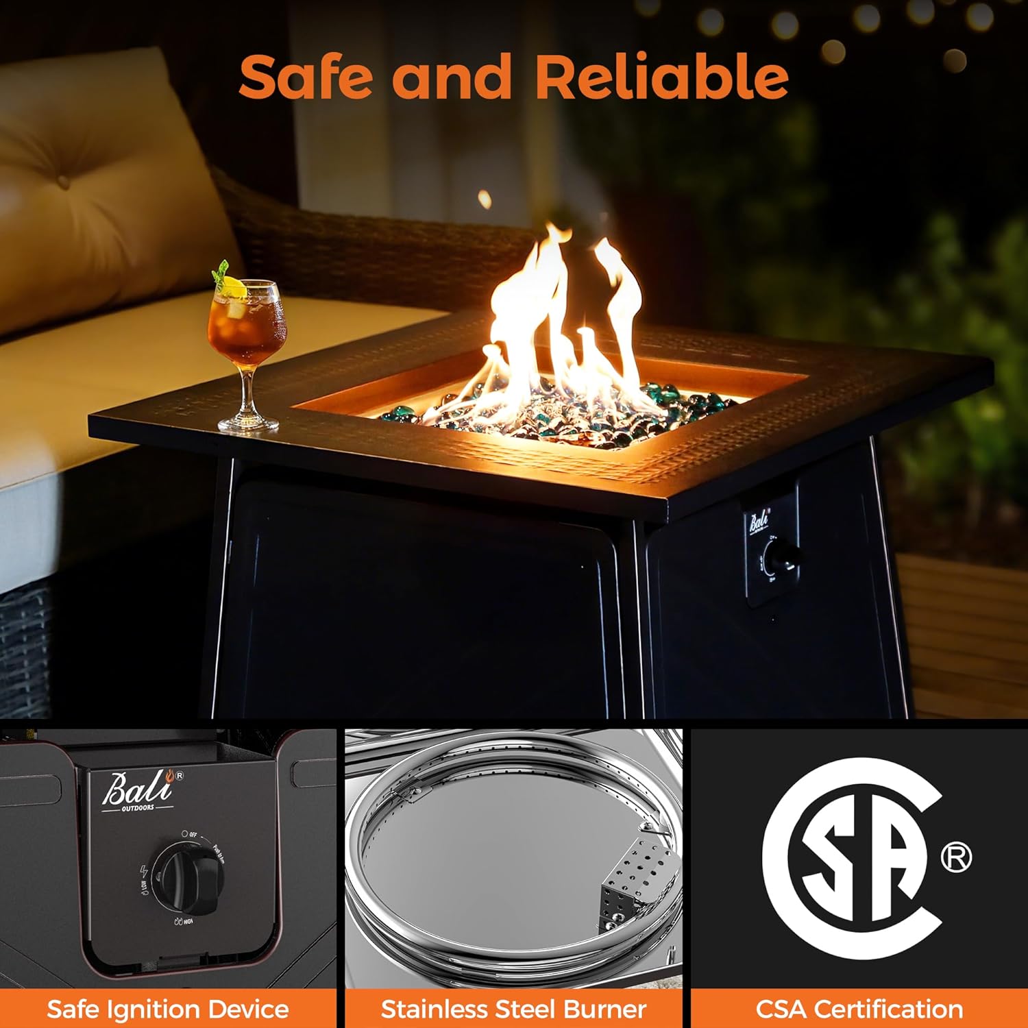 BALI OUTDOORS Gas FirePit Table, 28 inch 50,000 BTU Square Outdoor Propane Fire Pit Table with Lid and Blue Fire Glass