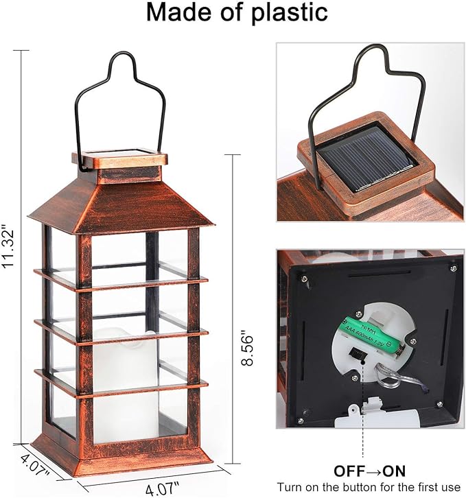 • ❤ 100% Solar powered ❤ The solar lantern collects sunlight during the day to charge the battery (included), turns on automatically at dusk, and the lighting time can be up to 8 hours. The bottom battery is replaceable, you can replace other ordinary batteries or rechargeable batteries. Not only can protect the environment, but also save you money!