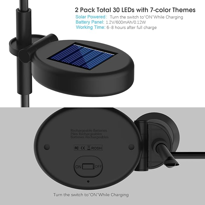 • 【Solar Garden Decor】These garden lights come with built-in rechargeable batteries, they can be automatically charged under sunlight. Fully charged battery will offer sustainable lighting for 6-8 hours after full charge.(Please note to turn the switch to “ON” while sunshine charging)