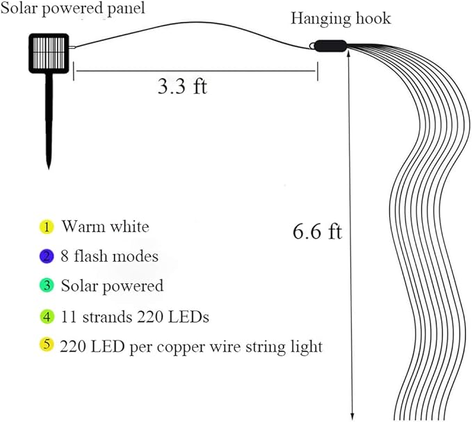 • Solar Waterfall Decor: Solar powered firefly bunch lights, 8 modes of adjustment (combination, wave, continuous, flash, flash, slow fade, flash and constant light), is an ideal decoration light for creating atmosphere.