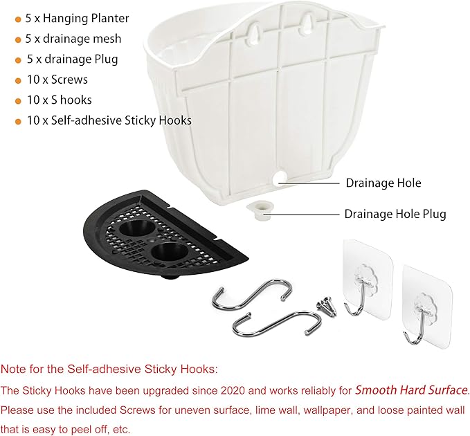 • INDOOR & OUTDOOR USE: vertical wall hanging planter made of high quality durable PP resin material, safe and non-toxic, this polypropylene resin planter is a tough, lightweight , all-weather durability with UV protection for outdoor use, an alternative to clay or ceramic planters. Install drainage plug when used indoors. SIZE (L*W*H): 8.1"x4.7"x6.8"; 10 x screw of stainless steel, 10 x S hook of stainless steel,10 x self-adhesive command wall hook included.