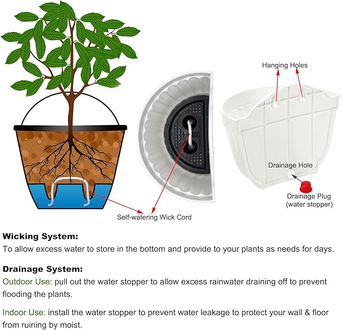 • PLANTER WITH DRAINAGE MESH & WATER RESERVIOR: hanging planter pots with drainage mesh to allow excess water to store in the bottom of this lazy flower pot and provide to your plants as needed to ensure plants take enough water they need for days, and you don't have to water them frequently. This clever hanging flower pots may help you care your plants when you go outside a couple days or on business.