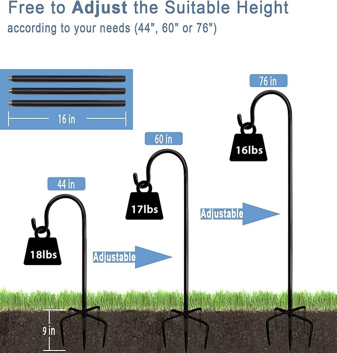 • ♥ Extendable & Tall Hook Hanger: The outside shepherd’s hook hanger made of 3/5 inch width & 2mm thickened steel pipe with 5 solid anchor points, you can free to adjust the suitable height for 76’’, 60 " or 44 ", and also make it stands firmly in the ground without easily falling down, no fear of severe weather such as strong winds, heavy rains, and blizzards, (2 PACK / SET)