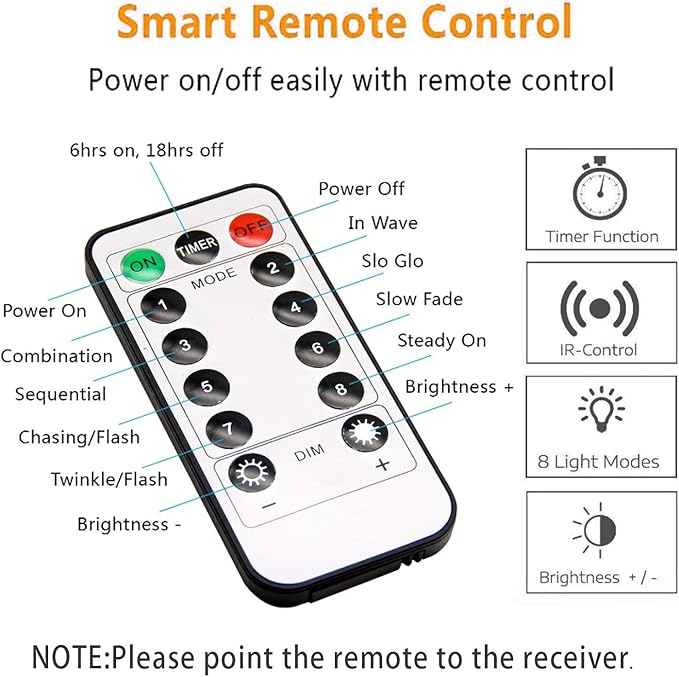 • 【8 Variable Modes】Variable mode (8 Modes) and brightness settings provide the perfect solution for your decorative lighting needs.Built-in memory chip will remember the last setting till the next time light up.