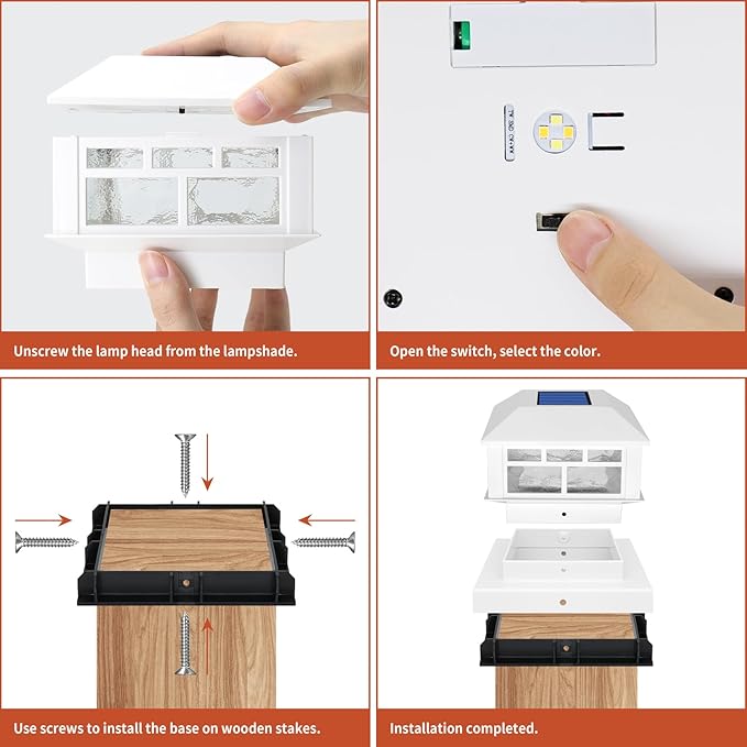 • 【Note】When you receive solar deck post lights, please turn ON switch.In addition, the battery may be out of power due to the long-term placement and transportation time, so please charge it in daytime for 4-6h to make the battery full charged. Please keep the solar panel always clean or it can not conducive to solar charging efficiently.If you have any problems, please read the manual and also feel free to contact us.