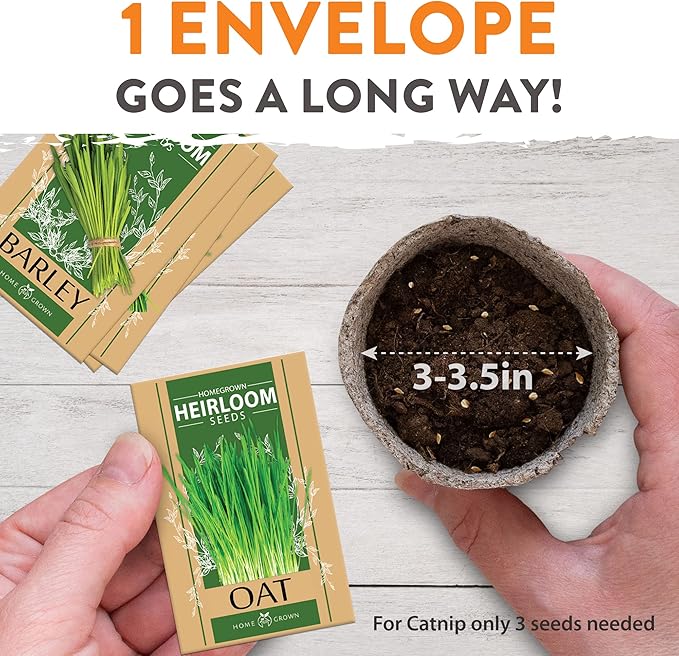 • Grows Indoors Quickly & Easily: Designed for hassle-free indoor cultivation, these seeds germinate quickly—typically within 5 to 7 days—so your cat can enjoy fresh greens in no time. All you need is a small container, soil or potting mix, water, and a bright windowsill. Perfect for any living space, from apartments to homes, it’s a low-maintenance way to enrich your pet’s daily routine.