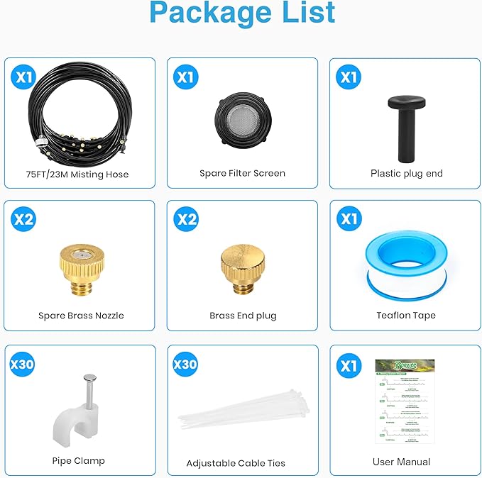 • ๐Ÿ’ง Premium Leak-Proof Design: This misting system is built from UV-resistant black PE tubing, upgraded brass mist nozzles for smooth and drip-free spraying, and secure, leak-proof connectors, ensuring durable performance.