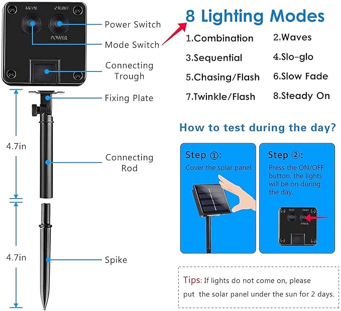 • Easy Installation: The solar panel can be charged by placing it in a sunny location and the lights are ready to use once charged.