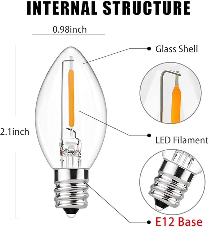 • Energy saving LED Bulbs: Clear glass C7 LED Lights bulbs with E12/ C7 candelabra base. 0.6W per bulbs, 120V, clear christmas lightsperfer Christmas tree, patio, garden roofline pathway lights decoration.If one bulb burnt, the others will steady lit.