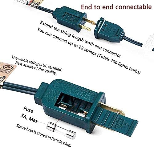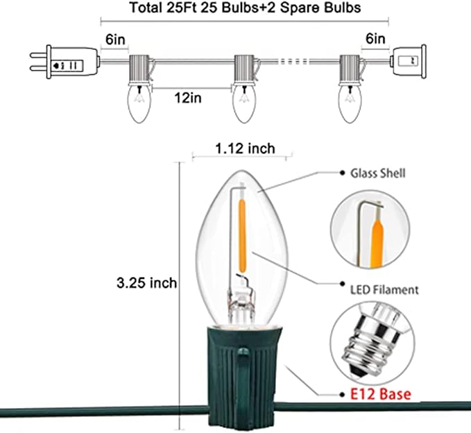 • End to End Connectable: LED clear C7 Christmas string lights 6 ''lead with male plug, 12 ''spacing between bulbs, 6 '' tail with female connector, total length 25 feet. 25Ft Christmas Outdoor LED Patio String Lights Connect up to 28 strand to meet your needs, you can hanging christmas light in garden, patio, Christmas tree