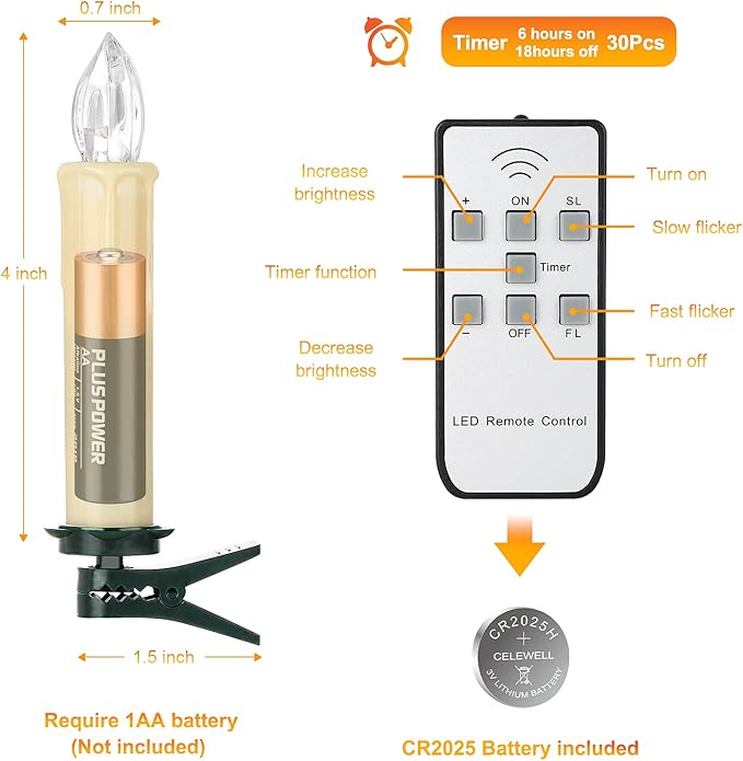 • PACKAGE:30*LED window candles(Batteries not included) , 30*clips,30*waterproof rings, 1*remote control, 1*user manual.Each led taper candle has thoroughly tested, if the flameless tapers has any problem.Please feel free to contact our customer service, we will try our best to help you.