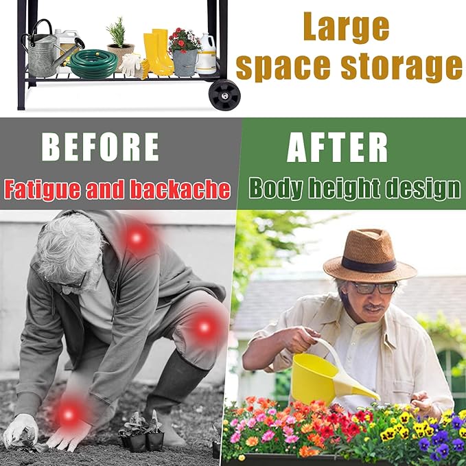 • Convenient Design: The raised flower pot with legs is high enough to avoid bending over, and it comes with two smooth wheels on one side and a handle on the other for easy movement.