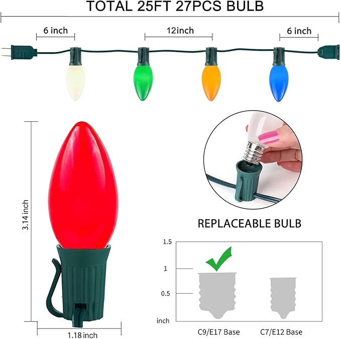 • C9 Incandescent Christmas Lights outdoor:C9 Christmas lights are designed with 7 watts per bulb, ensuring a brilliant illumination while conserving energy.Crafted with precision,christmas lights c9 come with a C9/E17 candelabra base and are UL Listed for both outdoor and indoor use. Their incandescent nature offers a warm, inviting ambiance.
