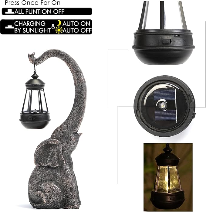 • Wide application: It can be a pathway light to be widely used such as pathway, driveway, flower beds, lawn, yard, patio, garden, balcony and so on. This elephant gifts also can be used as porch decor and even indoor decor where it could get sunshine during the day.