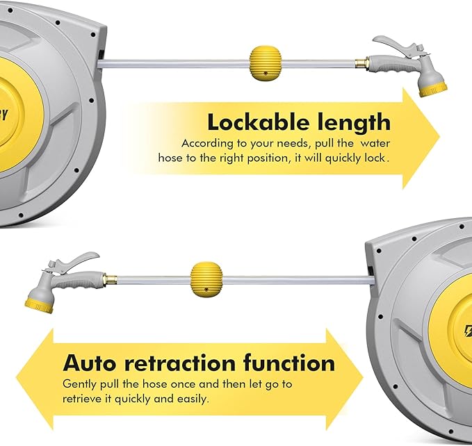 • Lock at Any Length:Our water hose can be recycled automatically. When you pull out the hose, the hose will be locked when you stop the water hose reel; when you pull them lightly, the hose will return to the hose reels for outside at a uniform speed. Our products have their own automatic locking and recycling mechanism. After nearly 10 years of verification, our function is very trustworthy.
