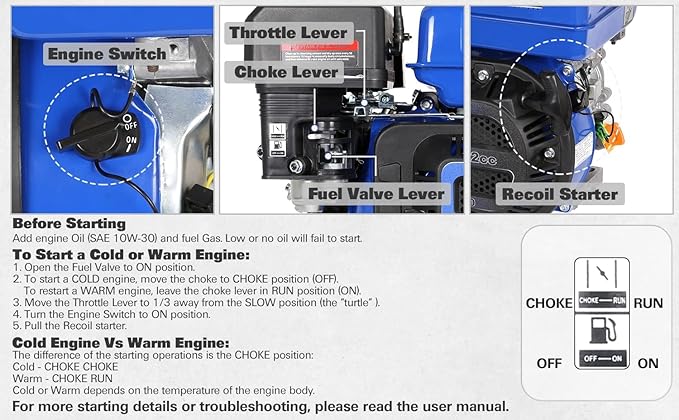 • Industrial Powerhouse - Our engine provides unwavering strength to tackle any task. Fuel Shut Off and gas-saving overhead valves maximize efficiency. The easy-reach recoil starter system features auto-decompression, ensuring effortless starts.