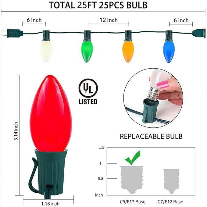 • Easy To Install: Set up your outdoor Christmas string lights in minutes. Extra one bulbs come in the box for replacement so you can remove the burnt out bulb and then install it. Your 100% Satisfaction is what drives us to be the best! If you are not fully satisfied for any reason, please contact us. For C9 bulbs, please search ASIN: B0995C3MX5