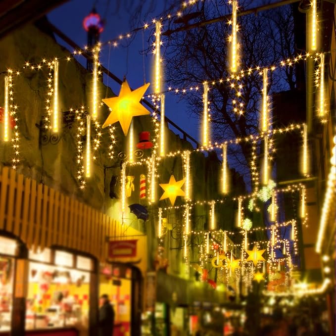 • 2-Pack 16 Tubes 384 LEDs Extendable Plug in Meteor Shower Lights for Christmas Decor: Super Bright with new upgraded LED bulbs, each bulb turn on and off one by one, like a realistic meteor shower.