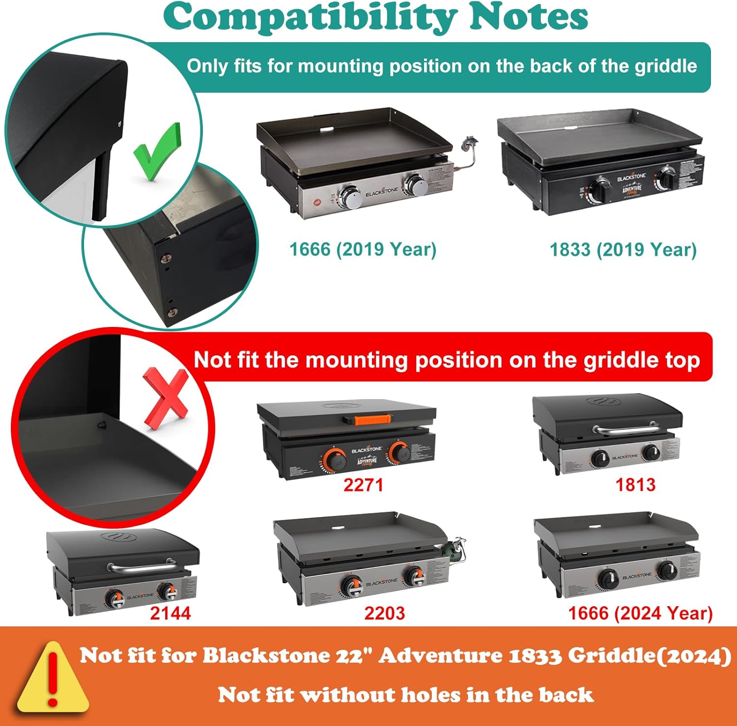• Package included 5011 Griddle Hard Cover. Compatible with Blackstone 22 inch Table Top Griddle【NOT Fit Adventure 1833(2024 Model) Griddle, Adventure Ready 2271, 2203, 2304,1666AZ,1666 and 1666SA (2024 Model)】Note: Please check if the grill supports back mounting before purchasing.
