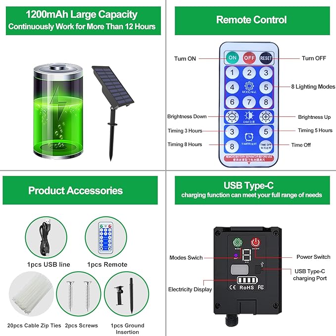 • 【High Battery Capacity & Safe】The solar string lights with 300pcs low-heat-emission LED bulbs, up to 19% high energy conversion rate comparing to others’ 13%. The solar fairy lights can work continuously for more than 12 hours at night if the panel absorbs enough sunshine during day. Meanwhile the fairy string lights is environmental friendly and energy efficient. The lights will not overheat after using many hours, so they are durable and safe to use.