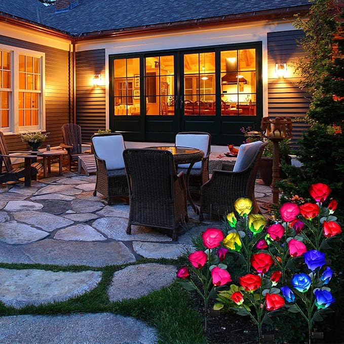 • Vivid and Realistic Solar Rose Flower: The solar garden light with 5 head vivid rose flowers and leaves, they look realistic in daylight from far away, it’s a great addition to your garden. And at night, it can light up your garden, your flowers, your plant, adds charm and elegance during night time hours