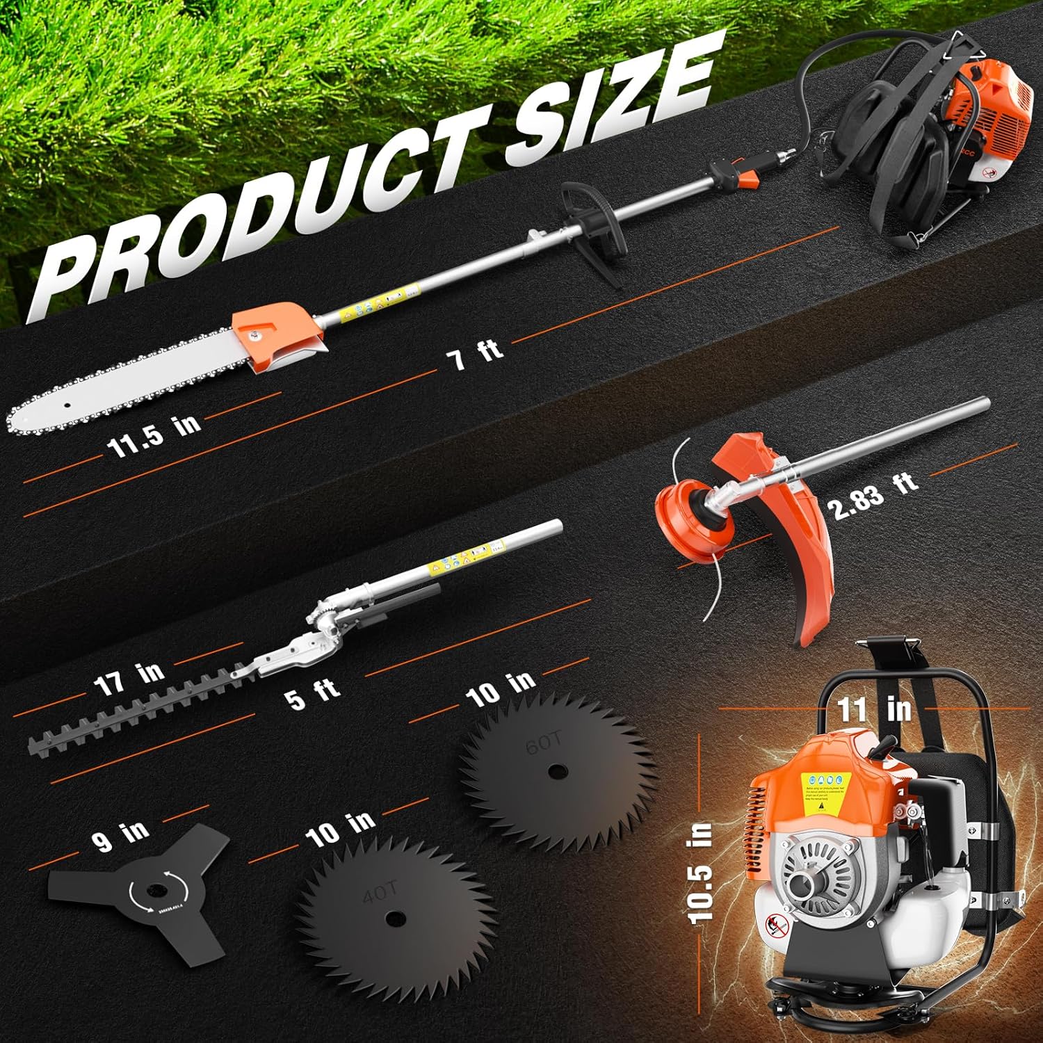 • Powered by the engine (52cc 2-stroke, Power 1100w), this powerful long reach 11.35FT(Total length) chainsaw (Pruner) lets you easily reach tall tree branches without a ladder.With backpack holder,the garden work effortless