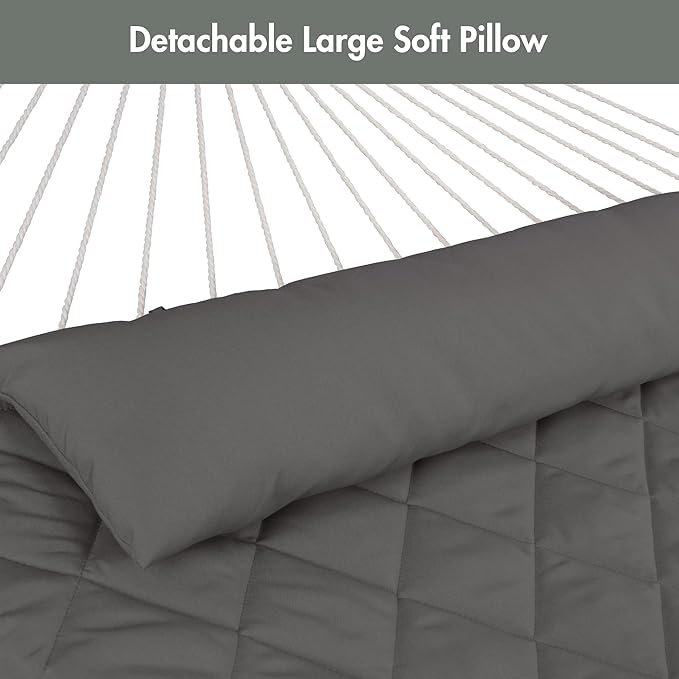 • COMFORTABLE & DURABLE: Double-layered quilted polyester fabric with inner polyester wadding is soft, breathable and long-lasting. Special sewing design increases the beauty and practicality of hammock swing. Extra polyethylene stuffing head pillow offers you superior comfort. Hammock pad is detachable for easy cleaning. It will not fade after long-term use