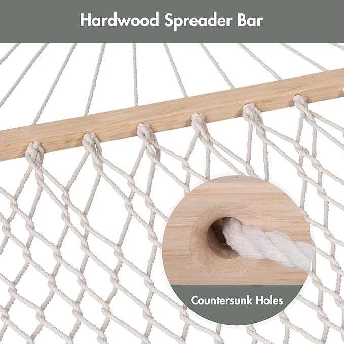 • SPREADER BAR HAMMOCK: 52 inches hardwood spreader bar has countersunk holes, hence reducing the friction between the rope and wood, offering maximum durability and stability. Our hammock significantly outperforms others’ non-countersunk varieties