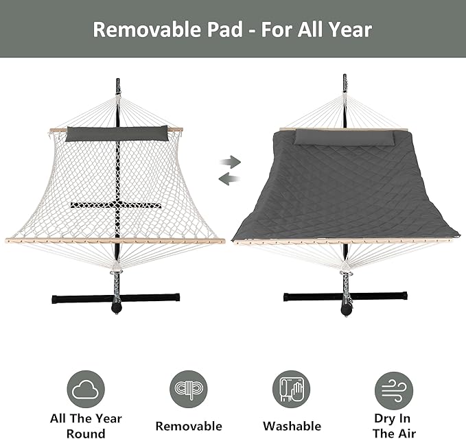 • COMFORTABLE & DURABLE: Double-layered quilted polyester fabric with inner polyester wadding is soft, breathable and long-lasting. Special sewing design increases the beauty and practicality of hammock swing. Extra polyethylene stuffing head pillow offers you superior comfort. Hammock pad is detachable for easy cleaning. It will not fade after long-term use