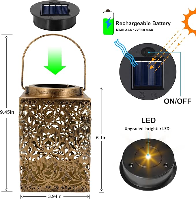 • Retro Solar Lanterns Outdoor Waterproof - Solidly built metal construction solar lantern with IP65 waterproof and be able to withstand outdoors year round, hold up all kinds of weather including rain and snow. There is a hole in the bottom of the lantern so it can be affixed to a table or bench with a screw. The outdoor lantern is solar, rechargeable, energy saving and environmental friendly.