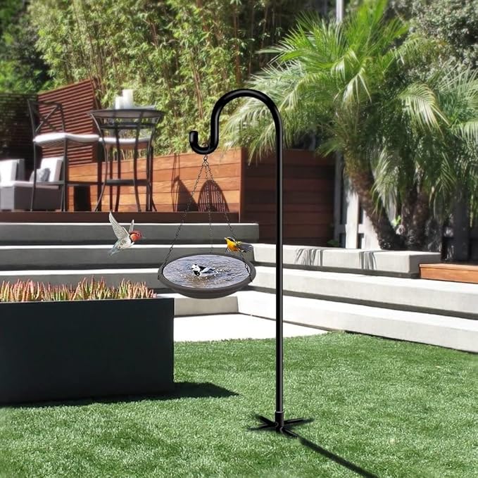 • EXCELLENT QUALITY: The free-standing bird feeders hanger come with 1 extra-long and 2 double-forked base prongs, provides with a strong grip and high stability because the cross-fork design is more stable than 2 or 3 prongs base. In the meantime, they are made of heavy duty metal pipes with smooth black powder coating, which is rust-free, water-proof when used outdoors and durable for lasting long service life.