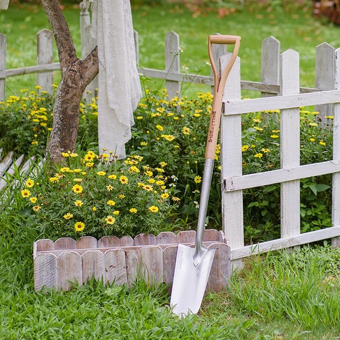 • 🌱Ergonomic Wood Handle: The handle of this planting spade is made of ash hardwood harvested from FSC-certified forests and has an ergonomically streamlined design, making it very suitable for everyone's hands. This specially designed handle can effectively reduce the fatigue of our hands and prevent injuries. The non-slip D-shaped handle keeps your wrist in a neutral position to reduce stress, providing comfort and good grip, which can firmly cut through hard and difficult surfaces.