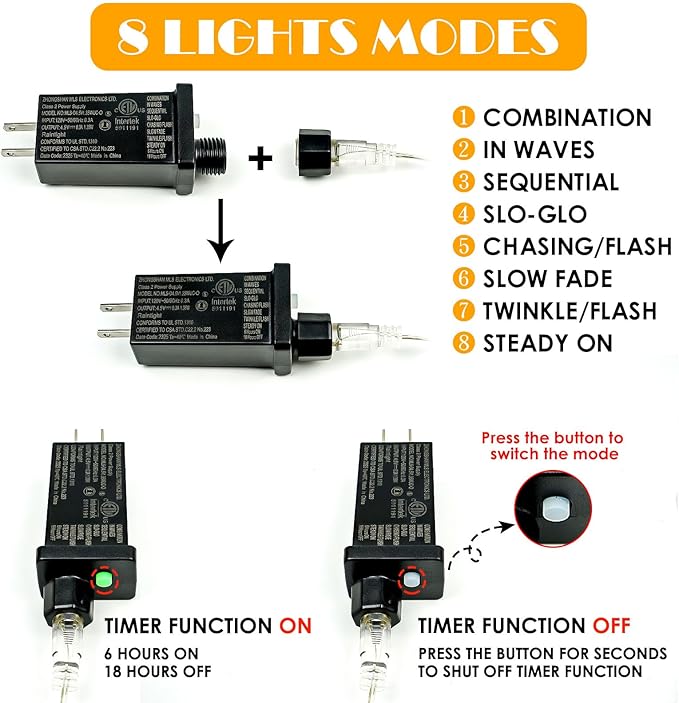 • Convenient Timer Function & 8 Modes & Memory Function: The button is at the end of the plug to turn on/off the timer function, press the button for few seconds till the green light on/off to turn on/off the timer function and switch 8 modes (combination, in waves, sequential, slo glo, chasing/flash, slow fade, twinkle/flash, steady on). This fairy lights could remember the setting of previous night you set.
