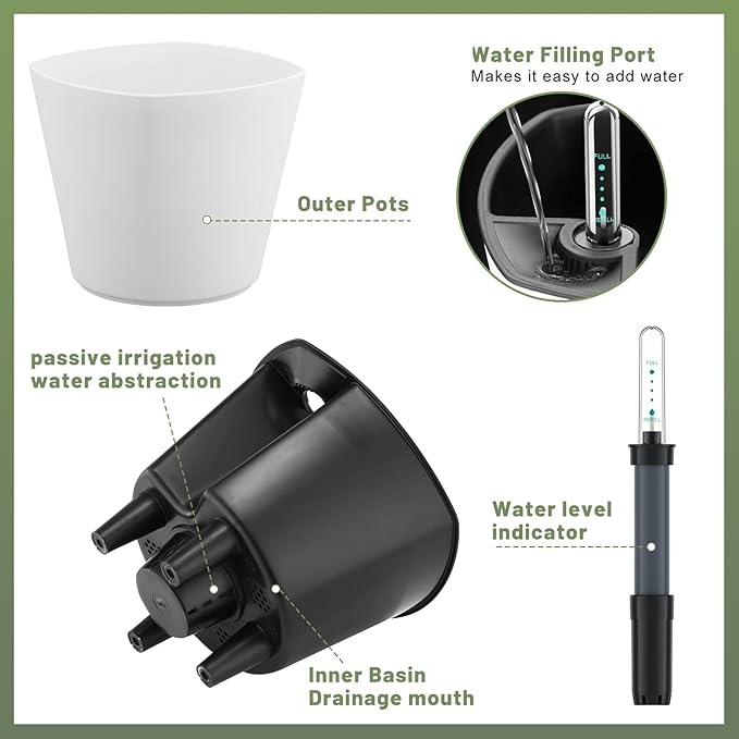 • Many self-watering pots do not have any drainage system, which can quickly lead to root rot. GS Garden's pot set has a unique support design that separates the plant's roots from the water storage layer, and promotes root growth and development through the micro-pores at the bottom of the inner, thereby creating root oxygen circulation.