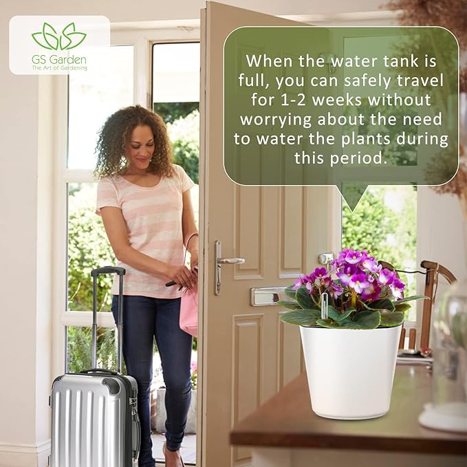 • GS Garden African violet pots function efficiently, taking care of your plants even when you can't. Self watering pots can help you keep your plants happy and thriving, even with your busy schedule. As a users, we are well aware of the joy and beauty that plants bring to the family. Self watering plant pot are specially designed planters for home gardening and modern decor. Suitable for all outdoor plants, herbs in kitchen, bedroom, study room, office, windowsill, balcony, garden, etc.