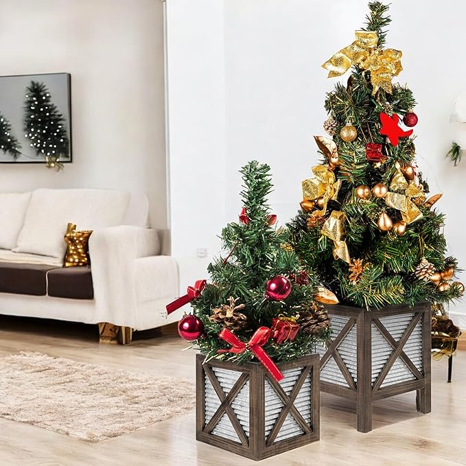 • Set of 2 Large Porch Planters - This set features two farmhouse-inspired planters, one with legs/stand and one without, offering versatility and visual intrigue. Crafted from durable corrugated metal, they effortlessly enhance your front porch with rustic elegance. Just pop your favorite flower pot inside and transform your space with an instant decor update!