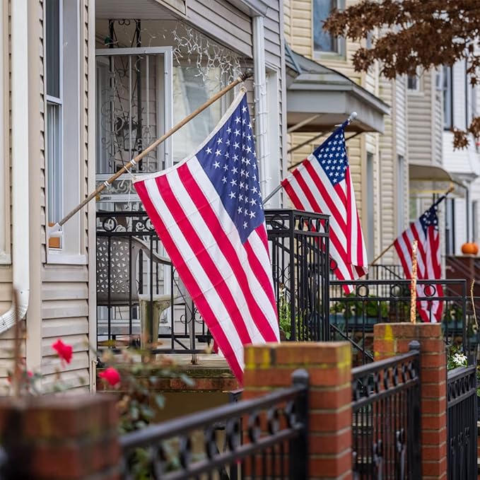 • SUPERIOR QUALITY: The flag consists of deep blue and red sheds. It expertly made of heavy duty nylon with two brass grommets. The strong grommets can keep the flag lasting flutter on the pole. Simultaneously this american flag for outside 4x6 is also an excellent choice as an indoor decoration