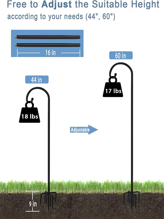 • Extendable & Tall Hook Hanger: The outside shepherd’s hook hanger made of 3/5 inch width & 2mm thickened steel pipe with 7 solid anchor points, you can free to adjust the suitable height for 60 " or 44 ", and also make it stands firmly in the ground without easily falling down, no fear of severe weather such as strong winds, heavy rains, and blizzards, (1 PACK / SET)