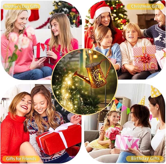 • Solar lights With Wide Application: Our solar watering can with lights(with Warm White Installed Light String) is good for DIY: watering plants, tree vines, potted, decorations, wedding, party ,dinner table, porch, bedroom, window, balcony, wall, Christmas,Thanksgiving, birthday , anywhere indoor or outdoor decor (Product includes shepherd's hook)