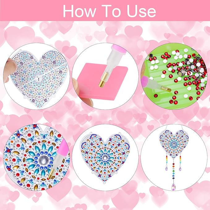 • 【HOW TO PLAY】:1.Open the package and check the kit is complete or not.2.According to the color code, paste the resin diamonds on plate.3.After finishing, put some heavy thing to make the diamonds stick more firmly.4.assemble the other accessories then you can hang it.