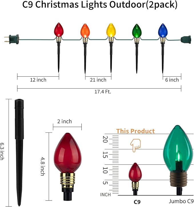 • Specifications of Christmas Path Lights Outdoor: 2 pack 17.4 feet C9 Christmas stake lights with 10 multicolored C9 bulbs. 21 inches light spacing, 6.7 inches pathway markers, plug in and enjoy it. This Christmas lights for the sidewalk will be great for your pathway, garden, courtyard, holiday decor