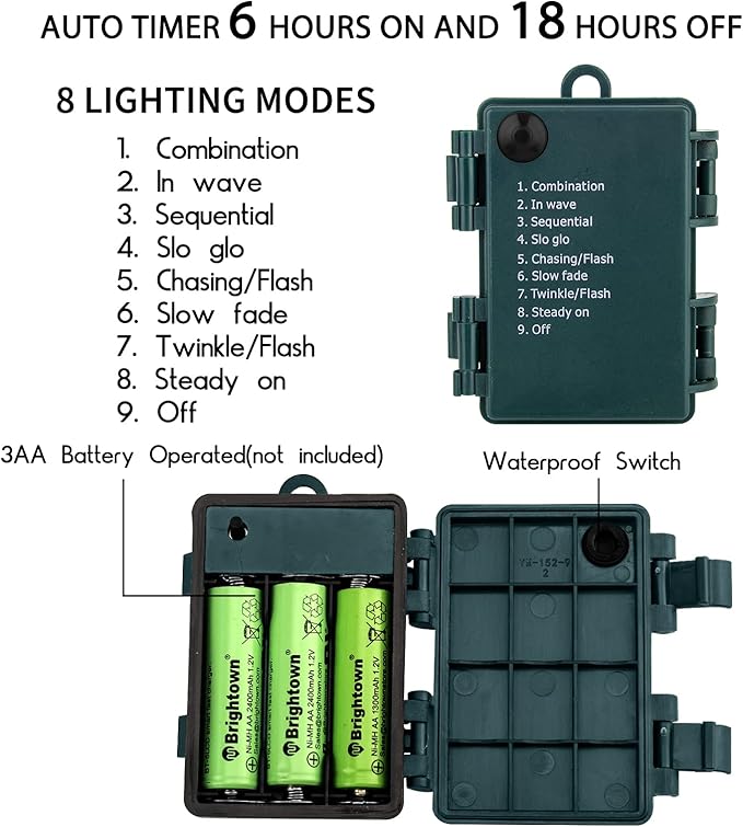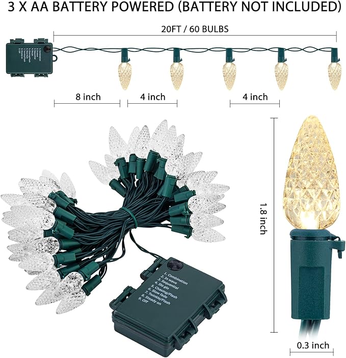 • 8 Lighting Modes: C6 Christmas Lights has 8 different lighting modes, including combination, in wave, sequential, slo glo, chasing/flash, slow fade, twinkle/flash, steady on. Press the button on the battery box to choose your favorite one