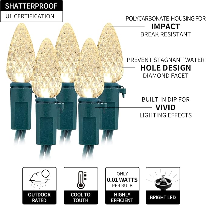 • Widely used: perfect outdoor Christmas C6 lights for Christmas trees, home, roof, garden, patio, balcony, porch, hallway, fence, shelf, commercial, bistro, pub, cafe, restaurant, shopping center, supermarket, New Year, birthday, gathering, disco ball party, dinner party, evening party, BBQ, ball, disco, bistro, pub, cafe, office