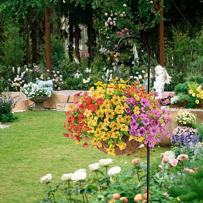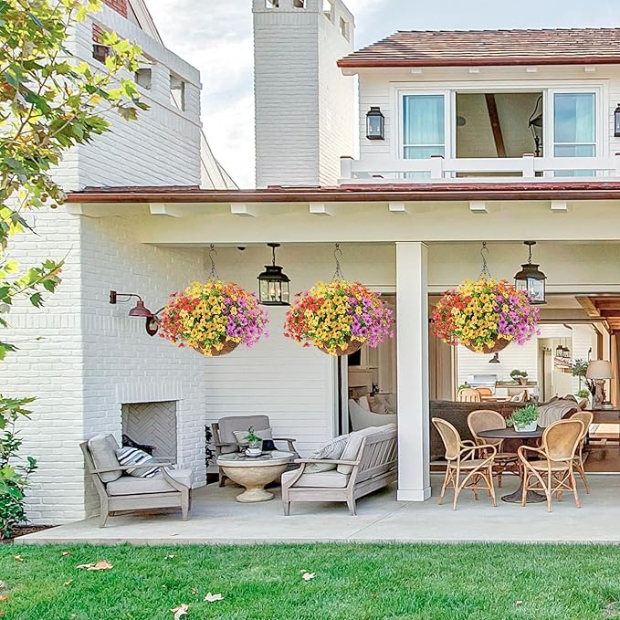 • UV-Resistant: Don't worry about fading – these artificial hanging outdoor flowers are UV-resistant to keep their vibrancy in the sun.